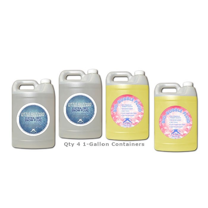 A case of fluids, comprised of (2) gallons of CITC Little Blizzard Extra Dry Snow Fluid and (2) gallons of CITC Bio-Bubble Bubble Fluid.