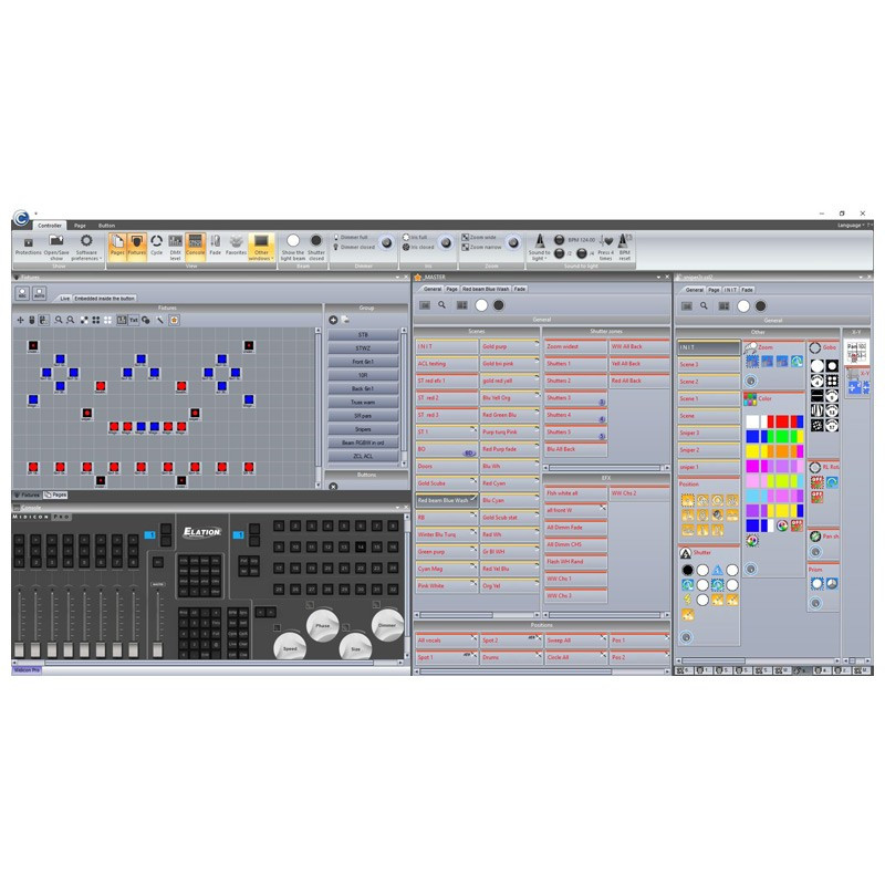 For instance, the EasyTime editor is based on a timeline. Thanks to this tool, it becomes very easy to build your show. Various effects, either static or dynamic (matrix effects, shapes...) are available and can be dragged to the timeline. Whether you are controlling moving heads or LED strips, this is the perfect tool. Palettes are also now available for positions, colors, beams or any other channel type that you wish to have palettes for. If a scene has been created using palettes, it can quickly be updated by editing the relevant palettes. Fixtures can be grouped, allowing for several fixtures to be controlled simultaneously on the fly. New CLEAR ALL and AUTO RELEASE functions allow for live edits to be quickly reset. This toolbar offers master control of your fixtures light beam. The toolbar gives you control of the dimmer, zoom, shutter, and the iris. The new cycle, or cue list, editor has a timeline built in. You can drag and drop buttons on the timeline to easily program cycles.