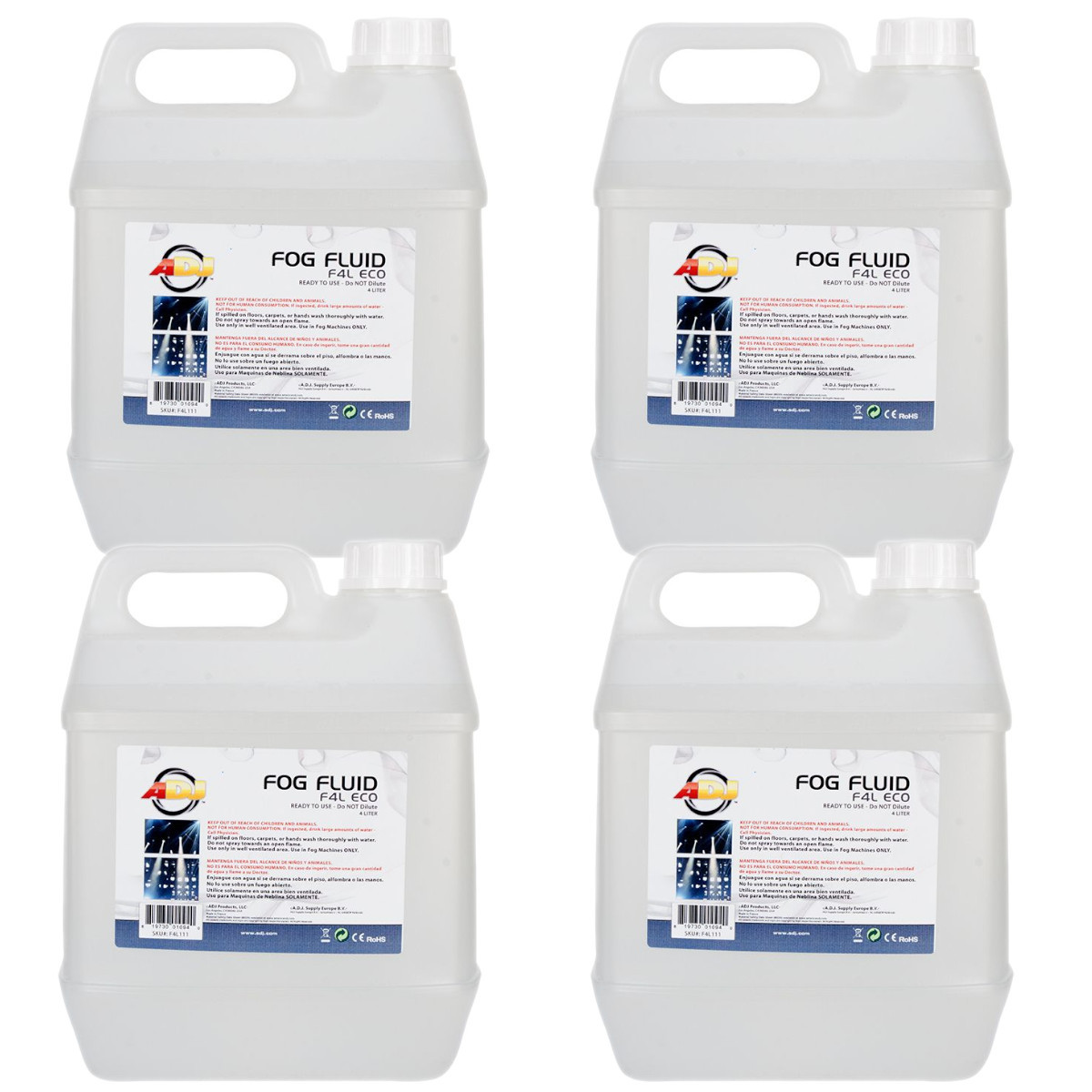 Four Liters of F4L ECO fog machine liquid from ADJ, designed to make the most of your fog production when used with an American DJ fog machine.