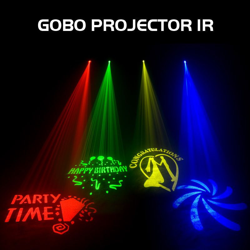 GOBO Projector IR12W mobile GOBO Projector comes with 4 GOBOs (3 metal, 1 glass), FX Switch to control rotation. It has a 13-degree beam angle with manual focus. Custom GOBOs may be inserted for monogramming events or company logos for corporate functions. There is a FX switch on the rear panel to control rotation or static movement. The Gobo Projector IR is compatible with the ADJ UC IR wireless remote.