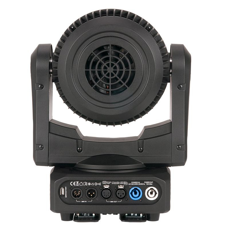 There are a variety of professional features such as: DMX and RDM control, pan & fine pan, tilt & fine tilt and a color display with 4 buttons to easily access all the built-in functions. Locking power In/Out to daisy chain the power and 3-pin and 5-pin XLR, DMX In/Out give lighting designers the best, most reliable connections on the market. There is also a built-in USB port to easily update the software if needed.