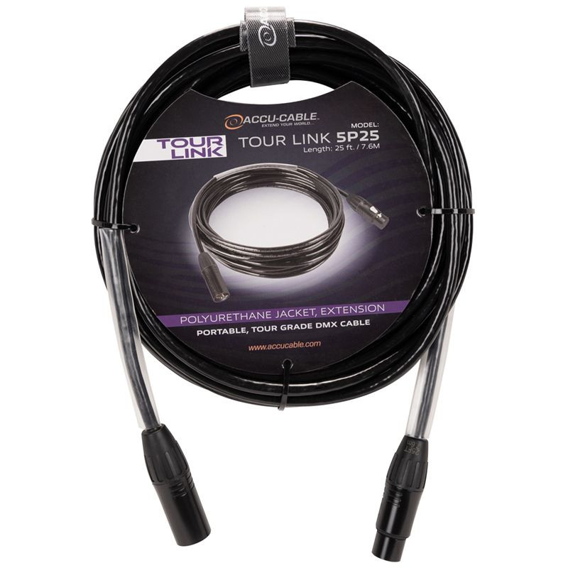 Tour Link 5P25, part of the Accu-Cable Tour Link Series, is a professional grade 25-foot, 5-pin male to 5-pin female DMX cable. Includes velcro strap, clear heat shrink tube and length stamped on connectors.