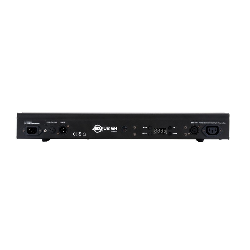 The UB 6H features built-in Color Macros (built-in preset colors), 4 DMX Channel Modes, 0-100% dimming and variable speed strobe. Plus, it offers flexible programming from its on-board 4-Button LED DMX-512 menu, or from the ADJ UC IR wireless remote and Airstream IR app.