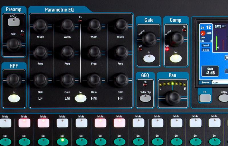 THE SUPERSTRIPAll your key processing tools are presented in a clean layout on the SuperStrip, with 1 function per physical control. The SuperStrip is complemented by an onscreen Touch Channel for intuitive access to full processing parameters without clutter or complex menu structures. Processing for Mono and Stereo inputs includes trim, polarity, HPF, gate, insert, 4 band PEQ, compressor and delay. The main LR and the Mono mixes have controls for Insert, 1/3 octave GEQ, compressor and delay. The Stereo mixes provide Insert, 4-band PEQ, compressor, delay and balance control.