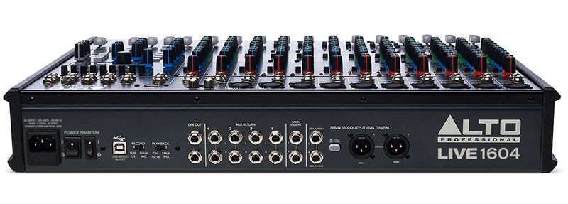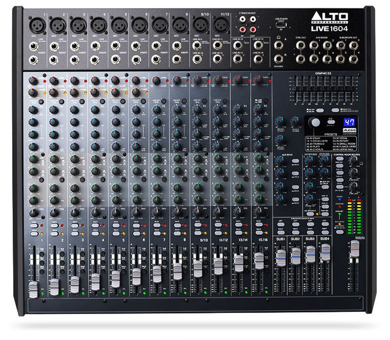 The Alto Professional LIVE1604 is a 16-Channel, 4-Bus Mixer with (10) XLR inputs with DNA mic preamps, Synamic compression (Channels 1-6), 3-band EQ with sweepable mids, 4 aux sends; pre/post switching on sends 1+2, 60mm faders with mute and PFL/AFL solo functions and 100 Alesis DSP effects.