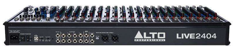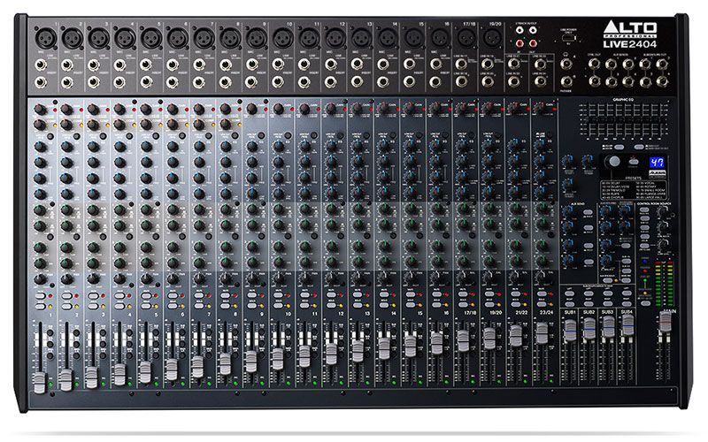 The Alto Professional LIVE2404 is a 24-Channel, 4-Bus Mixer with (18) XLR inputs with DNA mic preamps, Dynamic compression (Channels 1-8), 3-band EQ with sweepable mids, 4 aux sends; pre/post switching on sends 1+2, 60mm faders with mute and PFL/AFL solo functions and 100 Alesis DSP effects.