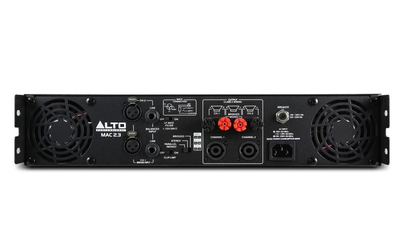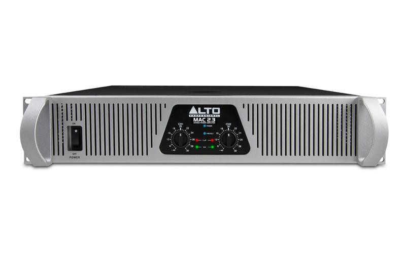 Everything about the Alto Professional MAC 2.3 is designed with your performance in mind. Multiple input and output formats allow easy connections to any system. Individual channel levels offer outstanding control, along with high-visibility LED status indicators. Efficient toroidal transformers ensure low noise levels. Each channel can drive a 2 O load for long periods of time, without overheating. Bridged for mono operation, the MAC 2.3 reliably supplies up to 2200 Watts (at 4 O) to keep those subwoofers thumping. Day after day, night after night, the MAC 2.3 is ready to enhance any DJ system, touring rig, stadium, or house of worship with ample amounts of the cleanest possible sound.