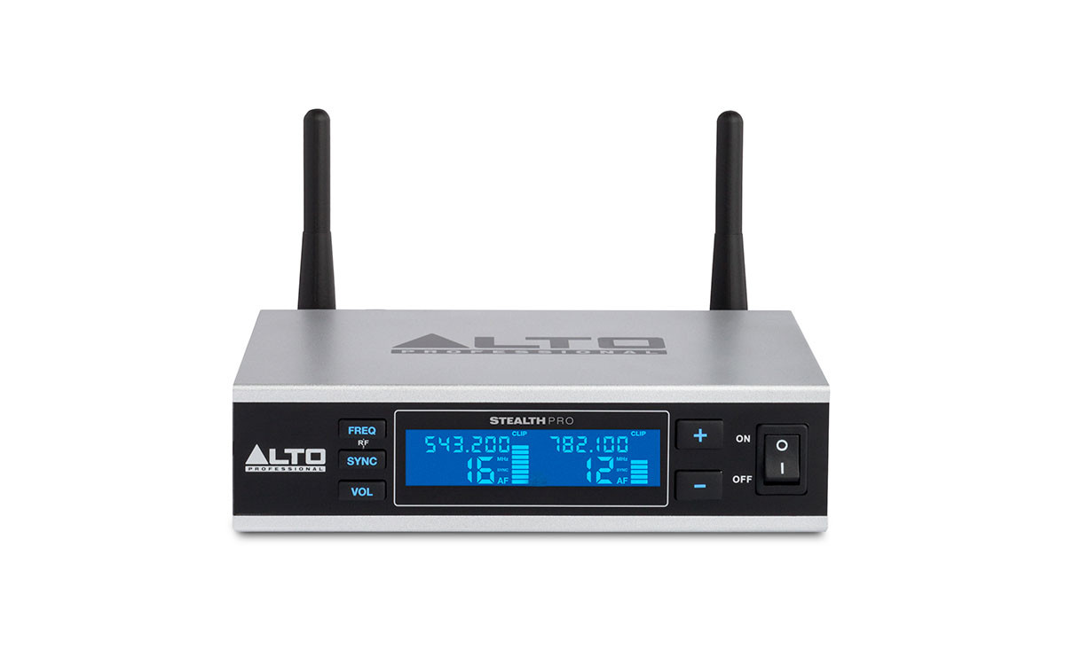 Stealth Pro contains a single dual-channel transmitter with a 2-antenna system (either dual mono or stereo switchable) for true diversity operation. A front panel LCD screen with dual frequency display conveniently shows the RF frequency and channel as well as the AF signal level for each channel.