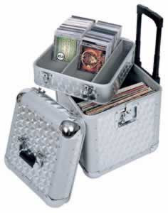 The case is on wheels with a retractable handle and holds 70 LP's, and 60 jewel case CD's or 180 view pack CD's.