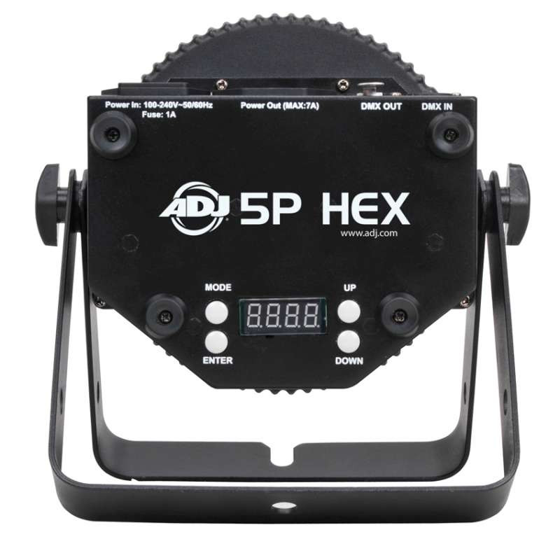 5P HEX professional features include: 4 DMX modes (6, 7, 8, & 12 channel), 5 operational modes, 5 dimming curves, flicker free operation and a 4-Button DMX menu with digital display. Daisy-chain up to 8 units together via the fixtures built-in IEC In/Out power connectors.