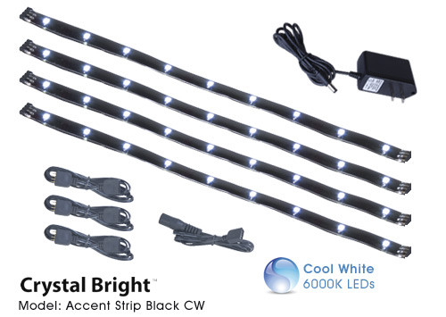 Included in each kit:• 4x 9.75-inch (250mm) self-adhesive strips with Cool White LEDs (6000K)