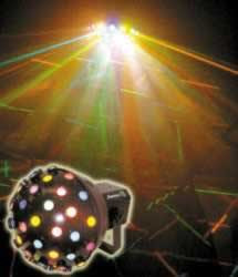 Extremely bright lighting effect with 3 x 300W quartz linear lamps that emit sharp, bright triangular beams. 48 lenses give a total of 144 beams that create the illusion of interweaving, overlapping, and color changing beams. Each beam rotates back and forth to a sound source.