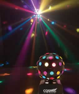 The Cosmic, from American DJ, is a linkable unit with other Advanced Drive series lights. The Cosmic has 52 rich, sharp beams of multi-colored light criss-crossing and moving back and forth.