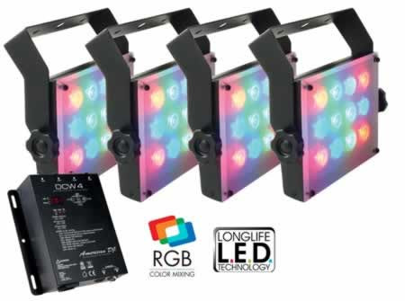 FEATURES: * Creates rich, even color wash lighting for any indoor architectural setting * 12x 1-Watt LEDs (4 Red, 4 Green & 4 Blue LEDs) per fixture * 3 Operation modes: Fixed Color, Fade Programs, DMX Control * 20 Fixed Colors generated from DCW 4 or create 1,000's of colors from a DMX controller * 9 Fade Programs with Adjustable Fade Speed * 2 DMX Channel Modes: 3 Channel Mode & 5 Channel Mode * Dimming & Strobing in 5 Channel Mode (Operational via separate DMX controller) * Control each light individually or all together in DMX Mode * Master/Slave Configuration * Light Weight, Compact Case Design * Built-In Mounting Plate on DCW 4 Controller * Maximum Power Consumption: 12W each fixture * Beam angle: 45-degrees