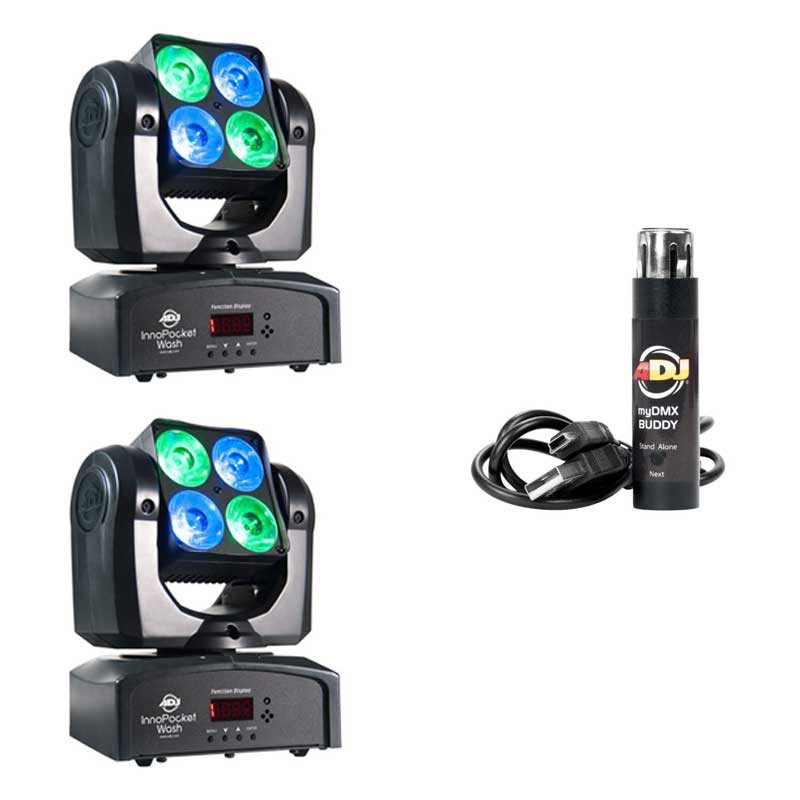 The American DJ MyDMX Buddy Wash Pak contains (2) Inno Pocket Wash moving heads, and (1) MyDMX Buddy DMX Control interface.