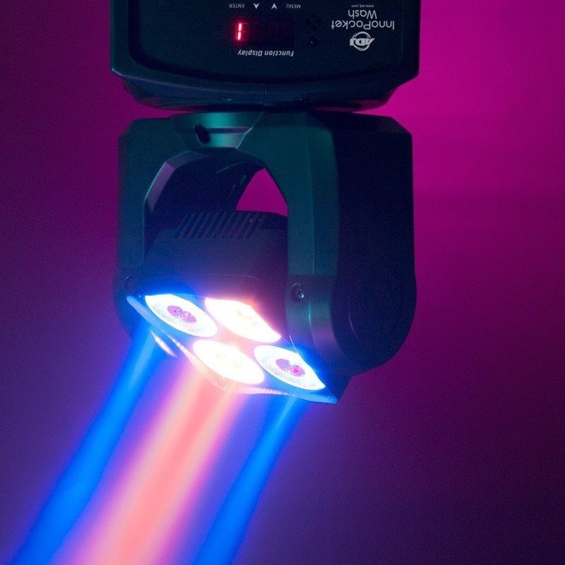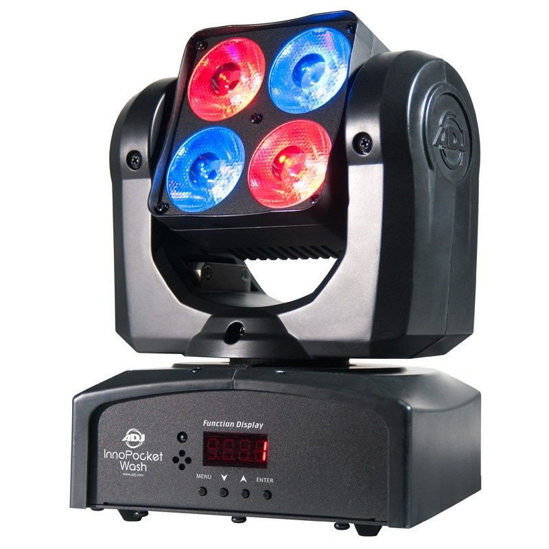 American DJ INNO POCKET WASH Moving Wash Head The Inno Pocket Wash is a mini Moving Head that creates beautiful washes of color with its 28-degrees beam angle. Its compact size and lightweight makes it ideal for mobile entertainers, small club and bars, roller rinks, bowling centers, churches or any mobile production.