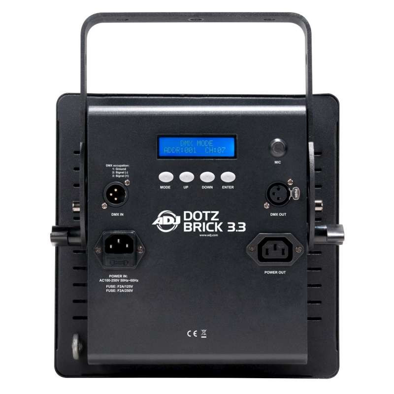 The fixture has many pro features such as: 0-100% electronic dimming, strobe/pulse effect, built-in shows and colors macros, and a 4-button LCD DMX display. Dotz BRICK 3.3 may run in its stand-alone mode from built-in programs, sound actively, or from a DMX Controller.