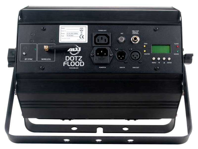 The fixture has many pro features such as: 0-100% electronic dimming, strobe/pulse effect, built-in shows and colors macros, and a 4-button LCD DMX display. Dotz Flood may run in its stand-alone mode from built-in programs, sound actively, or from a DMX Controller. It's also compatible with the ADJ UC3 Series controllers.
