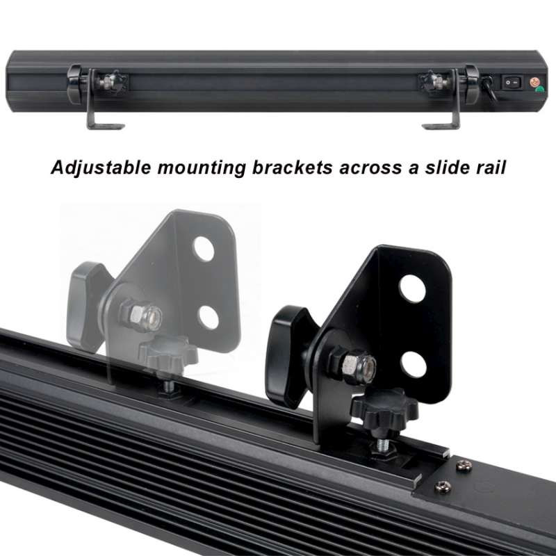 This eco-friendly UV linear fixture is equipped with adjustable mounting brackets across a slide rail. This allows users to get the perfect mounting position to attach to walls or ceilings. The mounting brackets may also allow for the fixture to be set on the ground for wall washing.