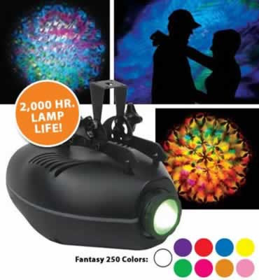 High powered 250W discharge projector produces multi-color 3D patterns: great for projecting on walls, ceilings, floors, buildings etc.