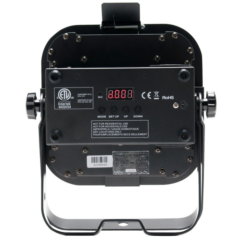 The units "low profile," sideways power & DMX Ins/Outs and dual hanging brackets make it ideal for mobile entertainers, permanent installations and for inserting into truss or for uplighting.