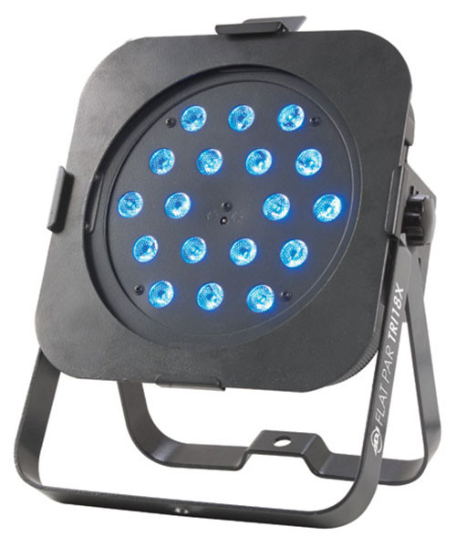 The ADJ Flat Par TRI18X is a professional "low profile" LED Par Can with extremely bright output. It features eighteen 3-Watt TRI LEDs (3-in-1 RGB) and will not cast any RGB shadows. The units "sit-flat" sideways power & DMX Ins/Outs and dual hanging brackets make it ideal for mobile entertainers, permanent installations and for inserting into truss for uplighting.