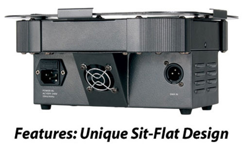 • New Feature - Unique "sit-flat" design: Power & DMX Ins/Outs sit sideways so the unit can be set flat on the ground or set inside truss
