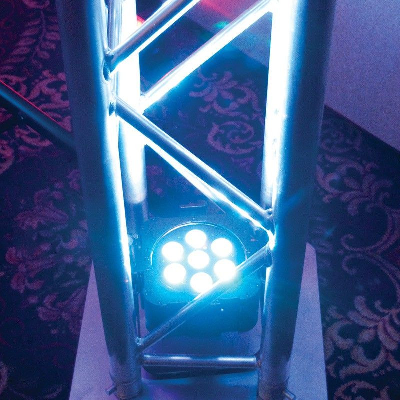 The ADJ Flat Par TRI7XS is a professional "low profile" LED Par Can with extremely bright output. It features seven 3-Watt TRI LEDs (3-in-1 RGB) and will not cast any RGB shadows. The units "low profile," sideways power & DMX Ins/Outs and dual hanging brackets make it ideal for mobile entertainers, permanent installations and for inserting into truss for uplighting.