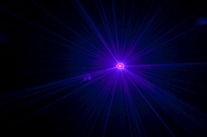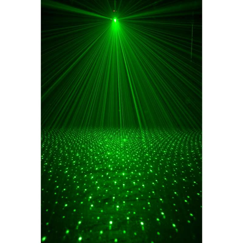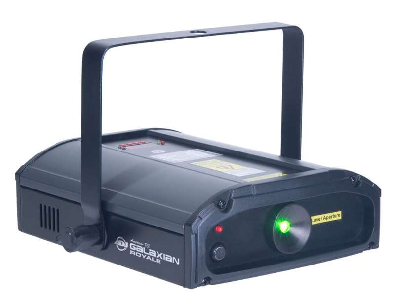 The American DJ Galaxian Royale produces over 500 purple and green laser beams/patterns that can be projected on a ceiling or wall. Massive beam spread covers a large area - great with or without fog.