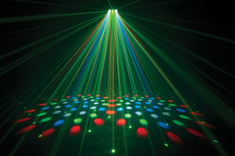 FEATURES:• 2-FX-IN-1: LED Dual Lens Moonflower with sharp Red, Green, Blue & White high output colored beams + "Galaxian style" effect with 100's of green beams
