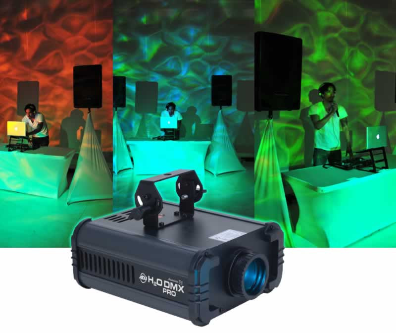 The American DJ H2O LED Pro is a multi-colored simulated water flowing effect with DMX-512 control and a bright, 50W LED source. The unit produces almost no heat, requires very little power (69W max) and can be used all night long. The LED is rated at 30,000 hours of use.