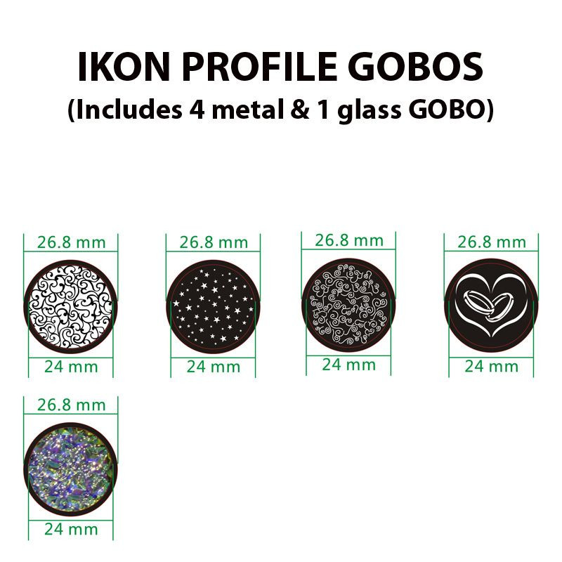 The Ikon Profile is a high output single GOBO Projector powered by a bright 32W (7500K) white LED. This fixture uses high quality optics for crisp, clear projection. User can adjust the LED brightness and strobing via DMX or by the included wireless UC IR remote control. It includes one textured glass GOBO. Users may also easily insert custom GOBOs in the fixture's GOBO slot located on the top of the fixture.