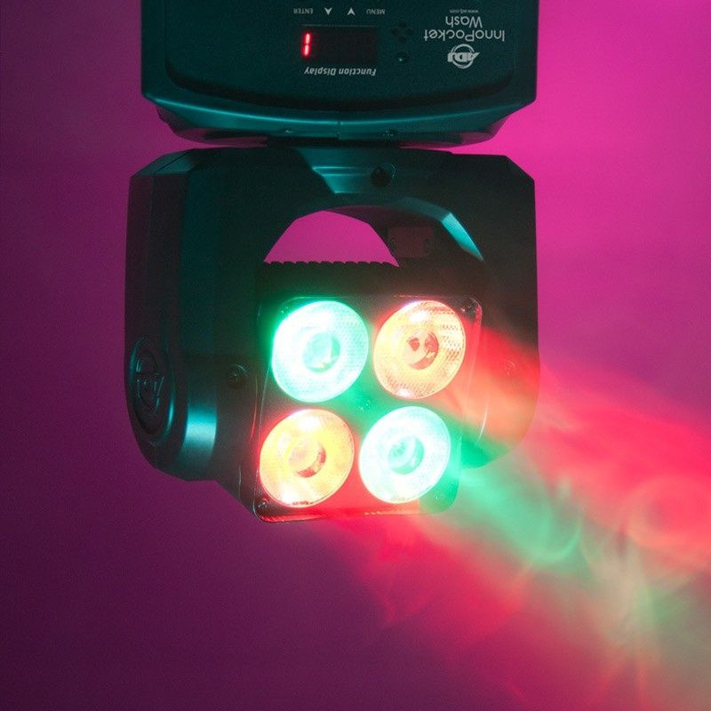 Featuring 4x 10W 4-IN1 Quad LEDs (RGBW - Red, Green, Blue and White), the Inno Pocket Wash will give pure lighting excitement with its fast moving head and brilliant washes of color. It has a pan and tilt inversion mode that makes one head do the opposite of another when linked together.