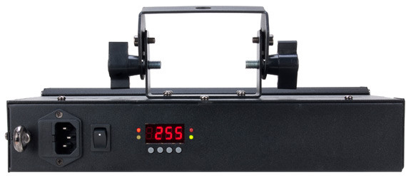 The LED UV GO is non-DMX. Use the included IR wireless remote or the 4-Button LED control system on the rear panel to operate the built-in functions, such as: Strobe effect, Dimming, and Blackout. This fixture uses LEDs rated at 50,000 hours with a maximum power draw of 53W.