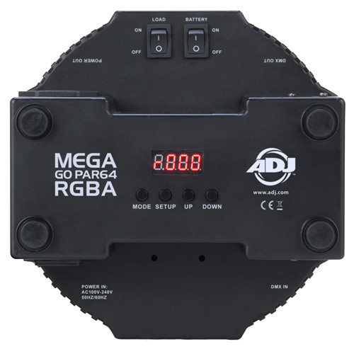 Mega Go Par 64 RGBAThe ADJ Mega Go Par 64 RGBA is a rechargeable lithium battery powered low profile LED Par Can that offers the creativity of RGBA color mixing for stage or wall washing, plus the freedom to set up your fixture where ever you wish without the restrictions of power. The built-in battery will keep a charge for up to 8 hours (full on) from a full, single charge.