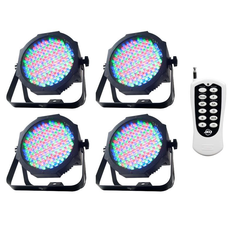The American DJ Mega Go Pak includes (4) Mega Go Par 64 RGBA wash lights and (1) ADJ RFC remote.