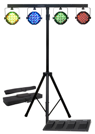 Par LED system which includes 4 x Mega Par Profile. Built in control with a variety of chase programs. Stand included with soft pack carrying case & foot controller.