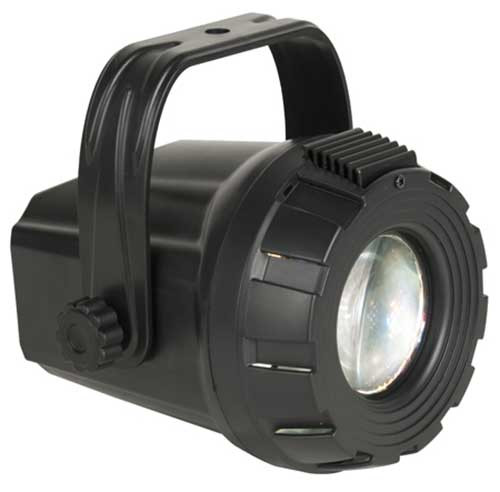 Compact LED moonflower effect, 3 watt LED, dichroic dish creates a multi colored sparkle effect. Sound active, plastic housing