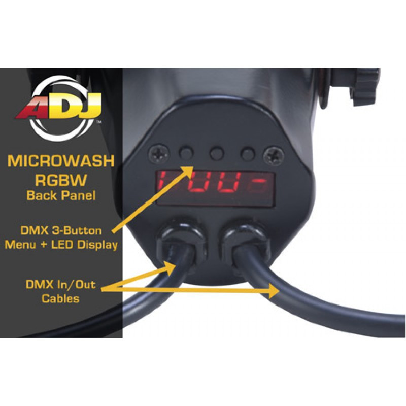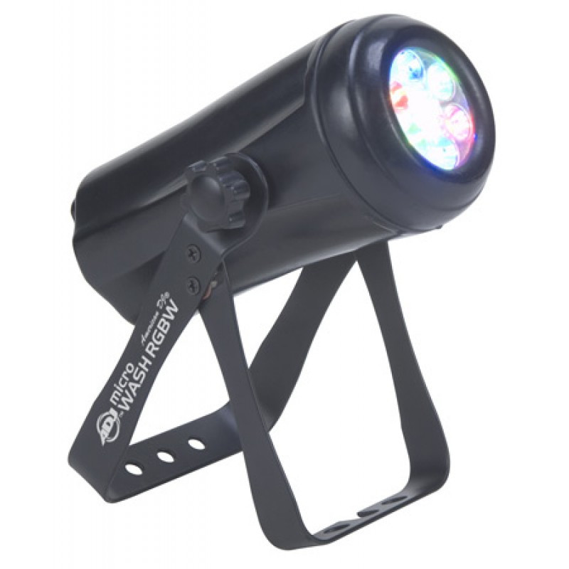 The Micro Wash RGBW is a mini par can with smooth RGBW color mixing from seven bright 1-Watt LEDs, and features DMX-512, flicker-free operation, 32 built-in color macros, strobing, electronic dimming and has a 3-Button DMX display system on the rear panel.