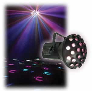 40 Beams move and change color. 7 multi-colored dichroic colors plus white. Sound activated. Includes hanging bracket. Fan cooled.
