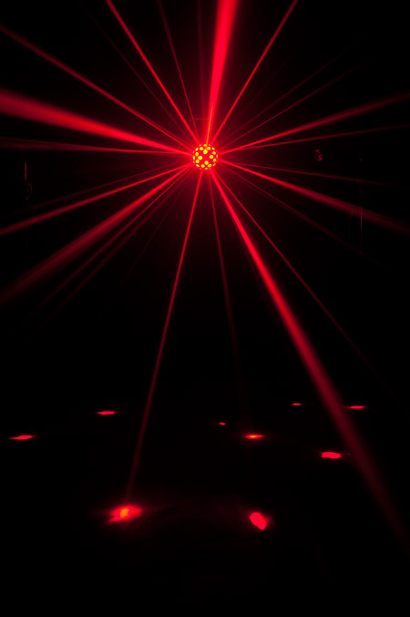 • Easy-to-use mini rotating ball produces 56 sound activated beams that change color and strobe to the sound of music