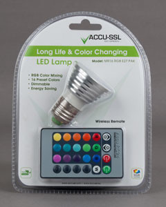 The MR16 RGB E27 PAK is an easy to install lighting effect, ideal for home decoration and your next party. It's an E27 based, multicolor LED lamp with build in color macros and programs. You are able to control the lamp via an included IR remote controller.