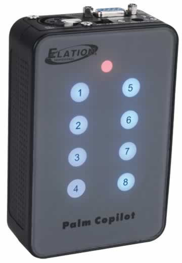 The American DJ PALM COPILOT compact 8-channel DMX/Analog touch sensitive lighting controller let's you control your lights from the palm of your hand! Works with DMX power pack or Light Copilot relay pack. Can be powered by 9V battery.