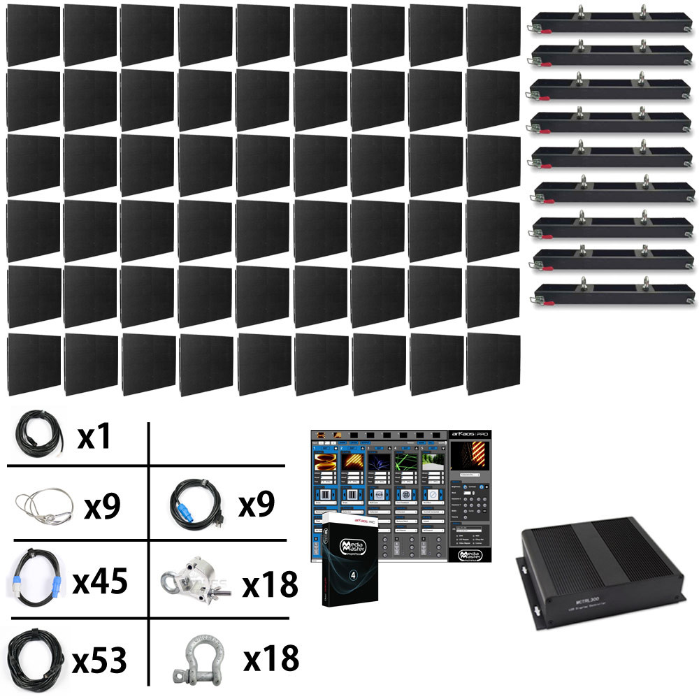 Measuring approximately 17.06 feet wide by 11.38 feet high, this pre-configured video wall package utilizes (54) ADJ AV6 video wall panels and includes the required driver, as well as all necessary powerCON linking cables, etherCON linking cables and rigging kits to properly hang the wall.