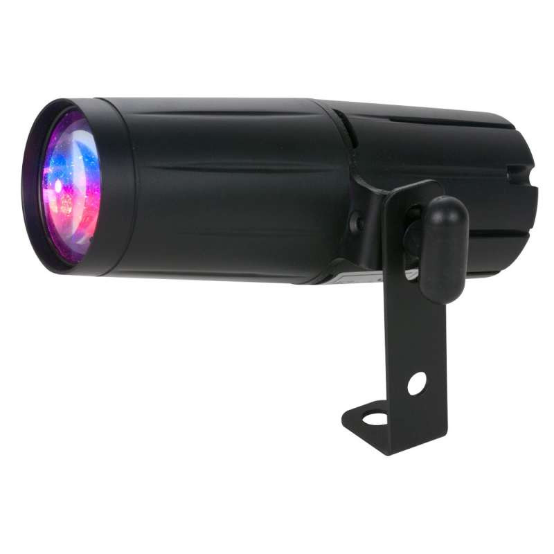 The ADJ Pinspot LED Quad is a 8-Watt Quad Color (4-IN-1) Pinspot with red, green, blue and white diodes on one LED. It produces sharp 15-degree beams on light, and is designed to spot tables, decor, architecture or used for special effects. Comes with a wireless IR remote to control color fades, built-in shows, dimming, strobe, black out and sound activation.