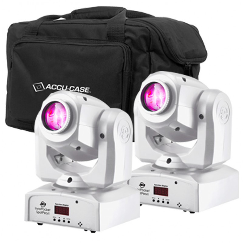 The Pocket Spot Pearl Pak includes two Inno Pocket Spot Pearl's and one F4 Par Bag. Each Inno Pocket Spot Pearl features 7 colors plus white, 7 fixed GOBOs plus spot and separate color wheels. Use in sound active mode or a dmx controller.