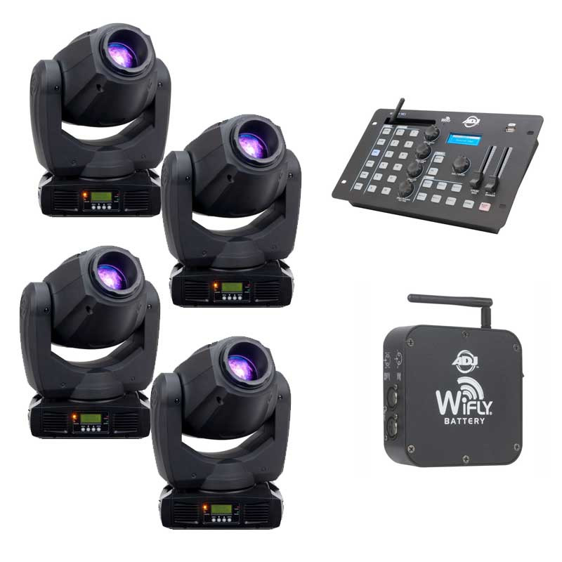 The American DJ Pro NE1 Pak contains (4) Inno Spot Pro Moving Heads, (1) Wifly NE1 wireless lighting controller and (1) Wifly Battery Wireless DMX Transceiver.
