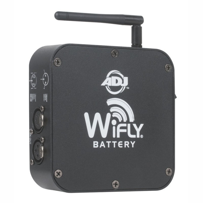 Wifly Battery Wireless DMX Transceiver The ADJ WiFLY Battery is a battery powered wireless DMX transceiver and after connecting to a DMX Controller users can send a constant and reliable wireless DMX signal up to 500 feet to other ADJ WiFLY products. It has a battery life of up to 20 hours. There are digital battery life and WiFLY wireless signal strength indicators on the side of the unit. It is the ideal solution for event productions, nightclubs, DJs, or for any event where you do not want data cables to be seen, and when it is not easy to run power and data cables to your fixtures location.