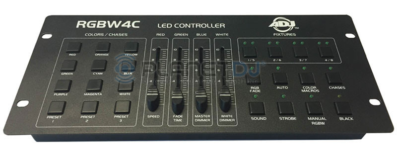 The RGBW4C is a 32-channel RGB, RGBW or RGBA LED controller. It was designed to control any standard 3 or 4 channel group of LED fixtures where channel 1 is Red, channel 2 is Green, channel 3 is Blue and channel 4 is White or Amber. Up to 8 LED fixtures or fixture groups can independently be controlled via four fixture buttons. All LED fixtures or fixture groups must be set to run in DMX mode and be addressed four channels apart for independent control. The units control panel includes 9 direct access "Static Color/Chase" buttons, which contain pre-programmed color presets and chase programs, 3 user programmable color preset buttons, 4 multi function faders that control RGBW intensities on the fly, as well as chase program "Speed", chase program "Fade Time" and "Master Dimmer". There is also an array of 8 buttons used to select the operation mode, including RGB Fade, Auto Run, Color Macro, Chase, Sound Active, Strobe, Manual RGBW and Blackout modes. The RGBW4C is one of the simplest and most versatile LED controllers available today. It's ideal for D.J.'s, nightclubs, lounges, bars and anyone that wants easy control of LED Par's, Bar's, Flood's or Panel's.