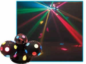 New and improved Glass optics and Heavy Duty A/C motor. The Rolling Star II is a three multi-colored balls that roll and project bright beams in all directions. The whole assembly turns 360 degrees!